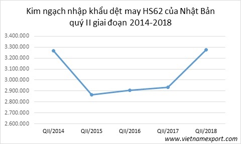 Năm 2017, kim ngạch nhập khẩu dệt may không dệt kim hoặc móc (mã HS62) của Nhật Bản đạt 13,56 tỷ USD, tăng 2% so với năm 2016, chiếm 6,7% tổng kim ngạch nhập khẩu nhóm hàng này của thế giới.