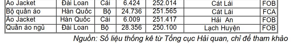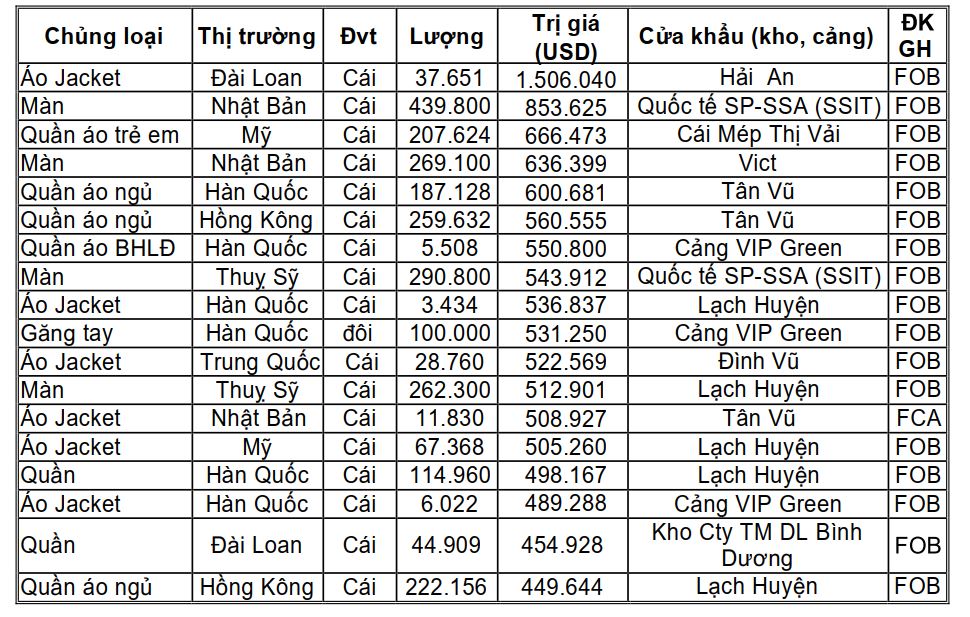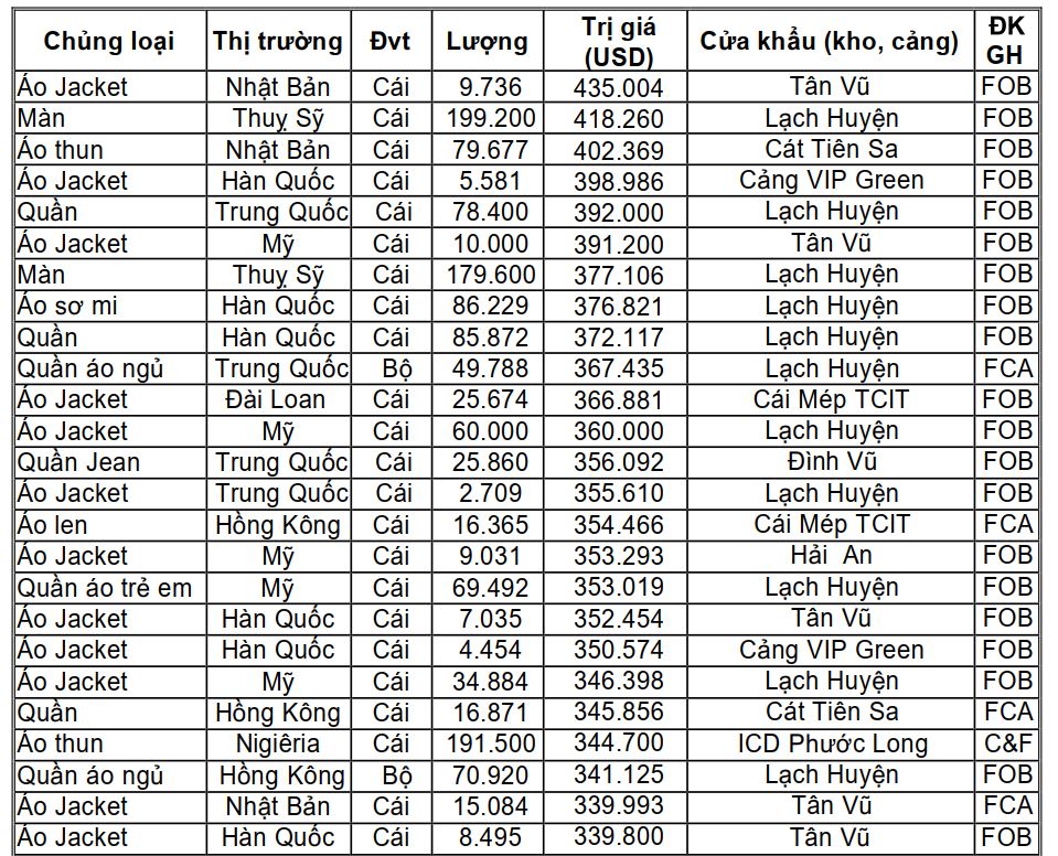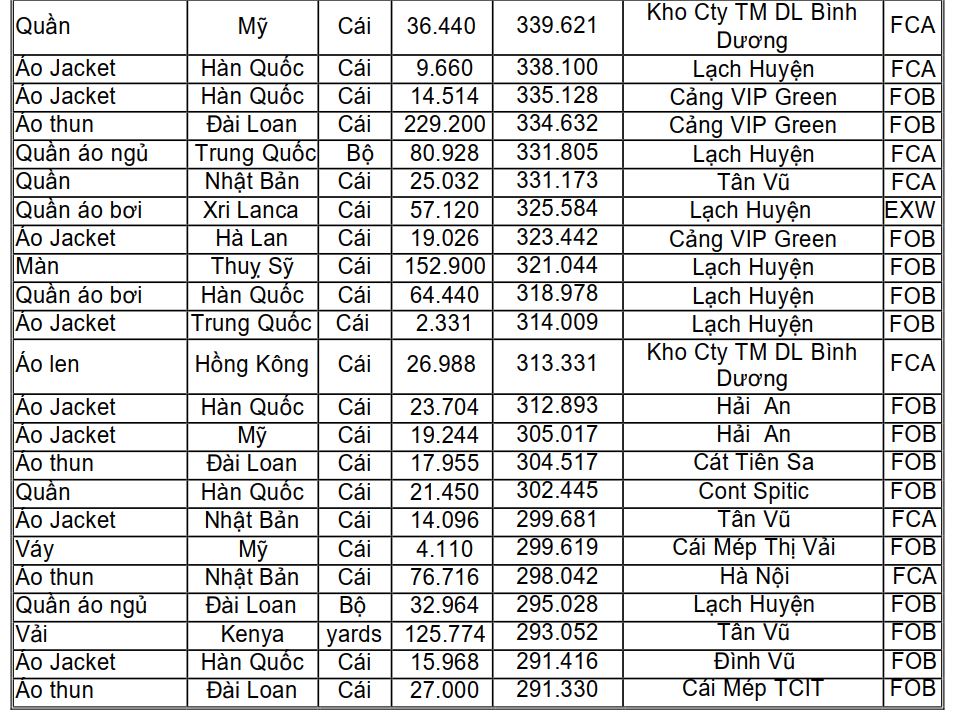 Tham khảo một số lô hàng dệt may xuất khẩu trong kỳ từ ngày 29/8 đến 06/9/2023